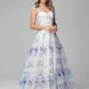This floral bridesmaid dress features a defined silhouette and structured design suitable for coordinated wedding events and formal ceremonies.