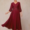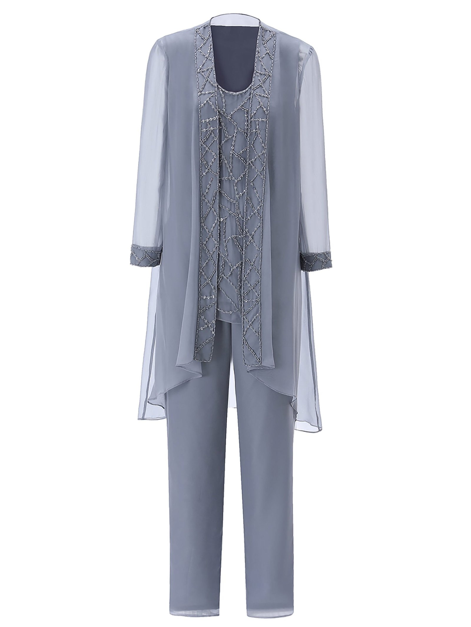 The long sleeves chiffon mother of the bride dress pant suits is designed with a graceful silhouette that balances structure and comfort for long wedding events. The bodice offers gentle shaping while maintaining ease of movement, and the skirt flows smoothly to create an elegant profile. Crafted from a soft, formal fabric, the dress feels comfortable against the skin while maintaining a polished appearance. Its thoughtful construction supports confident wear for mothers during ceremonies, receptions, and formal photographs. The overall design emphasizes timeless elegance, making it suitable for traditional, modern, and evening wedding settings.