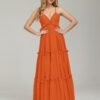 The short sleeves v-neck sequins prom dress with slit is crafted with a defined silhouette that enhances elegance while allowing comfortable movement throughout the evening. The structured bodice provides support and shape, while the flowing skirt adds visual drama suitable for prom settings. Made from smooth, formal fabric, the dress feels soft and polished, maintaining its look under evening lighting and photography. Its balanced construction makes it ideal for dancing, walking, and extended wear during prom events. The overall design delivers a confident, memorable appearance for formal youth celebrations.